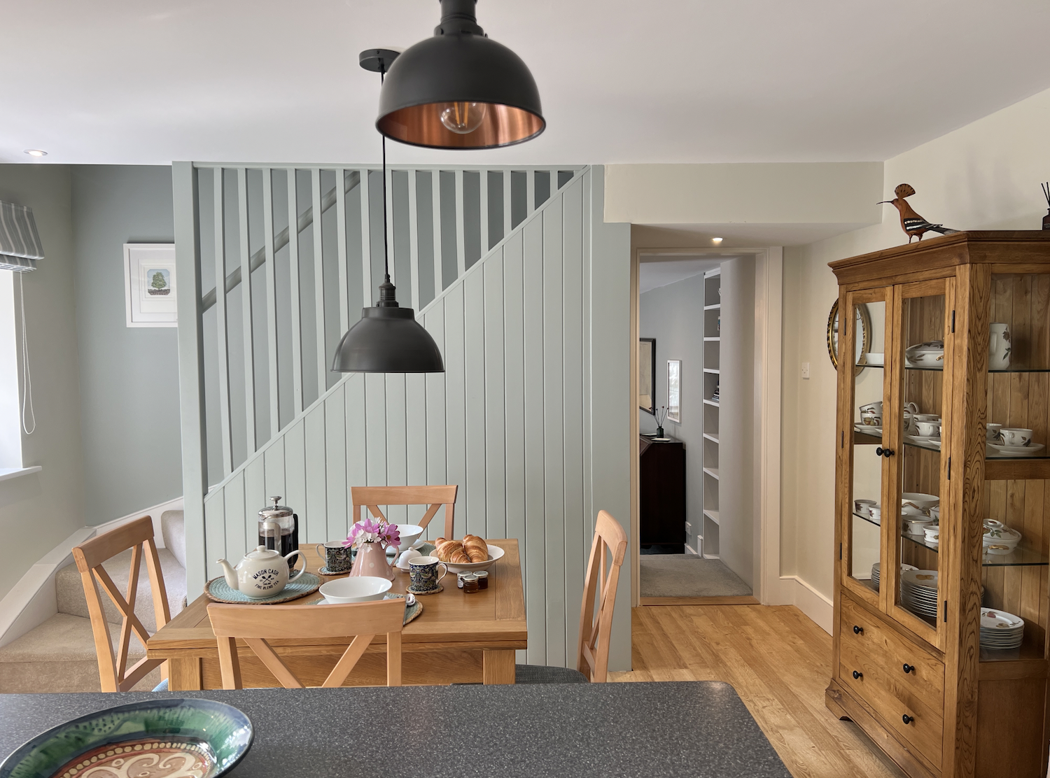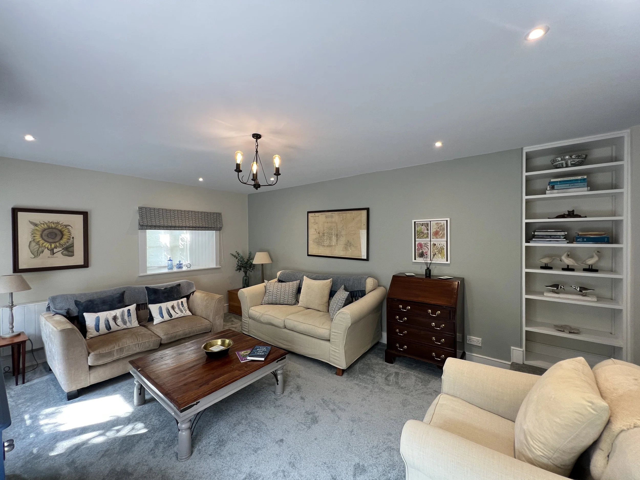 The ground floor has a spacious fully equipped kitchen/dining room and a large living room with views over the garden.